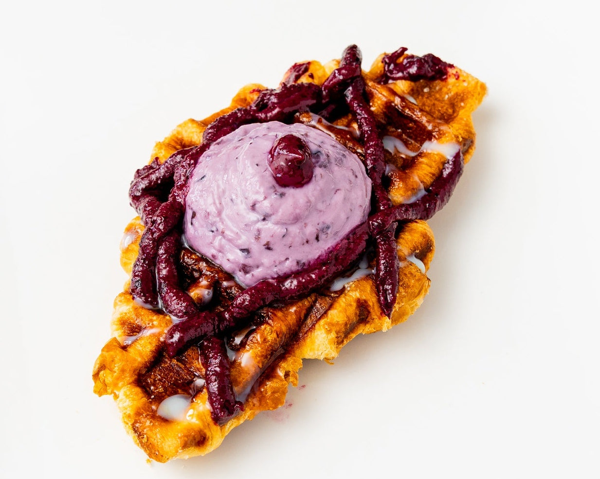 A croffle topped with a generous scoop of blueberry cream cheese.